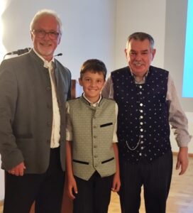 Der 1. Vorstand des Wasserbeschaffungsverbandes (WBV) Grabenstätt Karl-Heinz Austermayer (links) bedankte sich herzlich beim Ortsheimatpfleger Gustl Lex (rechts), der den Festabend „100 Jahre WBV Grabenstätt“ mit einem spannenden historischen Vortrag bereichert hatte. Für die zünftige Musik sorgte der Nachwuchs-Ziachspieler Maximilian Lukas aus Hirschau.